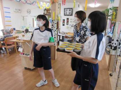 おやつの時間でした。利用者の方々にお茶をくばり、いくつものカステラがのったお盆を慎重に運んでいました。