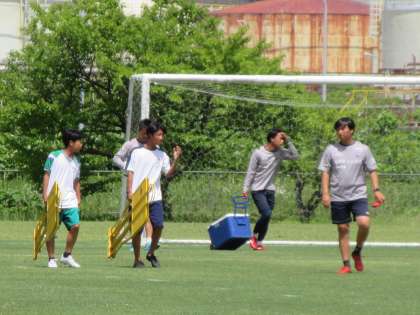 暑い中、カターレ富山の選手たちの練習サポートをしていました。コート外に出て行ったボールを拾ったり、練習道具の準備・片付けをしたりしていました。間近でプロ選手のプレーを見られることも勉強になります。