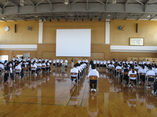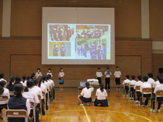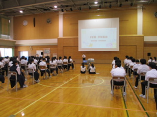 本日の学年集会では、学年生徒会から、写真とともに1学期の振り返りがありました。また、各学級の2学期の目標や学年全体のよい点と直すべき点について発表がありました。