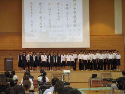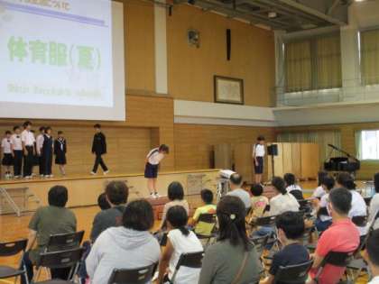 9月23日(土)学校紹介 公開日 2023/09/25 更新日 2023/09/25 学校行事 9月23日(土) 5限目の公開授業の後に学校説明会があり、1年生による学校紹介が行われました。 学校紹介では、ファッションショーで新庄中学校の様々な服装の紹介がありました。その後、学校行事や部活動の紹介があり、最後に校歌を披露しました。 学校紹介後は、小学校6年生が部活動見学をしました。