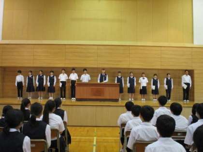 本日、後期生徒会役員の認証式及び任命式がありました。校長先生から役員へ、新生徒会長から執行委員、専門委員長へ任命された後、後期生徒会長の挨拶がありました。その後、校長先生から「活動後の振り返りを大切にしてほしい」とお話がありました。