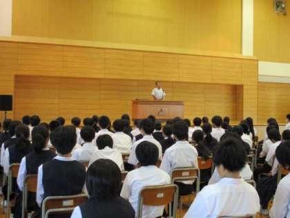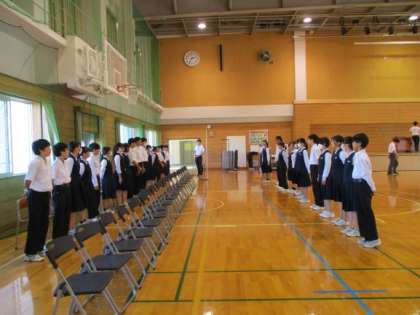 本日、後期生徒会役員の認証式及び任命式がありました。校長先生から役員へ、新生徒会長から執行委員、専門委員長へ任命された後、後期生徒会長の挨拶がありました。その後、校長先生から「活動後の振り返りを大切にしてほしい」とお話がありました。