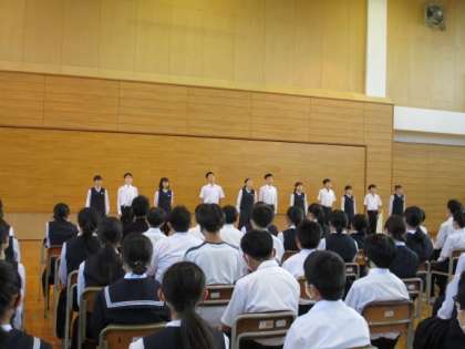 1学年では本日、後期最初の学年集会がありました。前期の学年生徒会がこれまで協力してくれたことに感謝を述べました。その後、後期の学年生徒会から決意が述べられました。