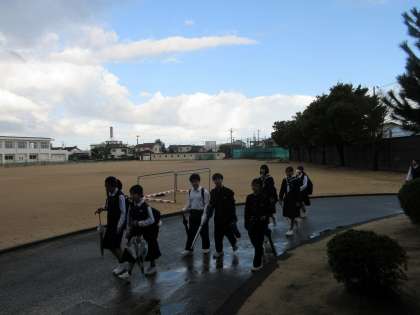 登校時間は急に強い雨が降りました。雨具がない生徒もみられました。