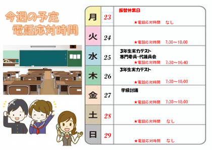 そのため、電話応対時間も、全校的には16時40分に完全下校しておりますが、その延長した生徒が無事帰宅できる時間を考え、ノー部活動Dayの水曜日を除いては18時までに設定してあります。
