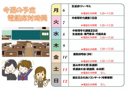 そのため、全ての曜日で、完全下校時刻が16時40分となりますので、今週の電話応対時間は7:30〜17:30となります。
