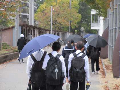 11月10日(金) 登校風景 公開日 2023/11/10 更新日 2023/11/10 そ の 他 曇り空から雨に変わってきました。 週末は雨、雨のあとは気温が下がっていきそうです。 来週は防寒着が必要になるかもしれません。 本日は3年生の進路説明会が開かれます。 11月に入り本格的に進路を考える時期になってきています。