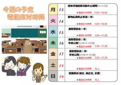 3学年で、進路懇談会を実施する関係で、15日(水)〜17日(金)は電話応対時間は17時半まで延長いたします。