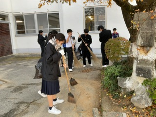 本日の放課後は、環境委員会が企画した落ち葉拾いがありました。各学級の環境委員に加えて、有志ボランティアが自転車置き場や生徒玄関前〜正面玄関前の落ち葉を拾いました。