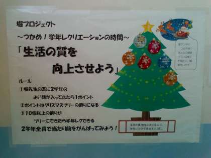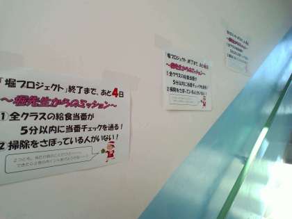 2学年では、生活の質を向上させるため、プロジェクトを実施しています。2学年主任の堀先生の耳に良い話が入ってこれば1ポイント貯まり、10ポイントで学年レクリエーションをすることができます。「堀プロジェクト」終了まで残り4日です!全員が当たり前のことを当たり前にできるように取り組みましょう!
