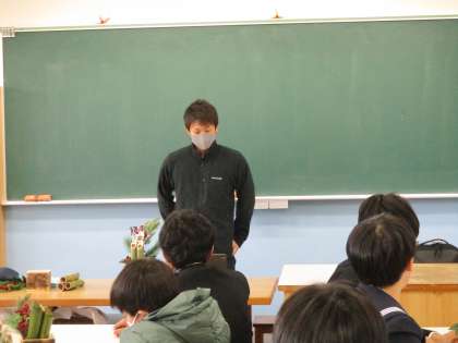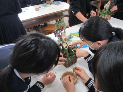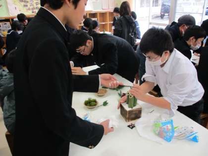 12月18日(月) 門松製作教室 公開日 2023/12/19 更新日 2023/12/19 生徒会 12月18日(月) 日頃お世話になっている地域の方々へ感謝の気持ちを伝えようと門松製作教室が開かれ、約30人の生徒が集まりました。講師に金岡正法さんを迎え、門松づくりが進められました。製作した門松は、地域の様々な場所に届けられる予定です。