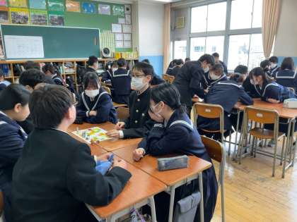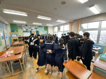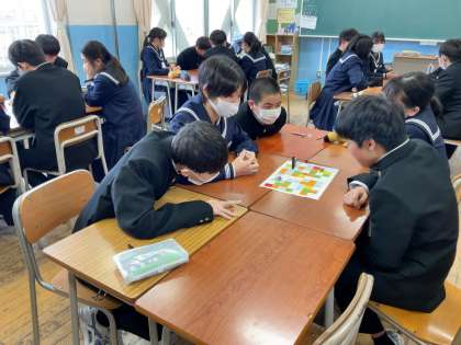 すごろくトークで班で楽しく会話したり、クラスで円陣をし、3学期に向けて気合いを入れている学級もありました。