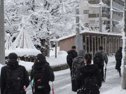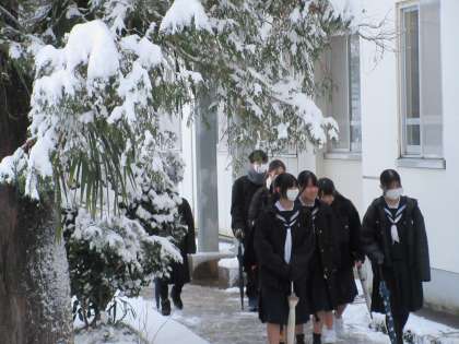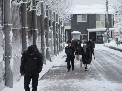 1月16日(火) 公開日 2024/01/16 更新日 2024/01/16 そ の 他 雪が降り積もる朝です。 昼間までは降り続きそうです。 明日は氷点下の最低気温が予想されています。 明日朝は凍結しますので、転倒等に注意をして早めに家を出るようにお願いします。 今日は3年生は校内での最後の実力テストに挑みます。