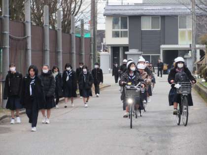 1月31日(水) 登校風景 公開日 2024/01/31 更新日 2024/01/31 そ の 他 曇り空の朝になりました。 明日の私立高校一般入試に向けて登校する3年生の表情は緊張感が漂いだしています。 感染症も流行しています。体調管理には充分気をつけてください。