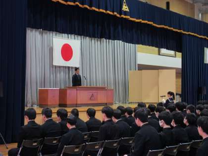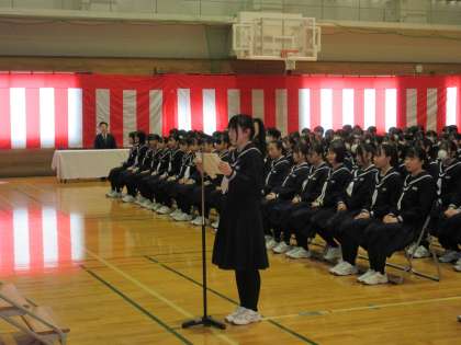 卒業式前日、同窓会長さん・PTA会長さんが臨席され、同窓会入会式とPTA記念品授与式が行われました。記念品授与の後、生徒代表が中学校を巣立ちこれから頑張っていくことを述べました。同窓会役員の紹介も行われました。