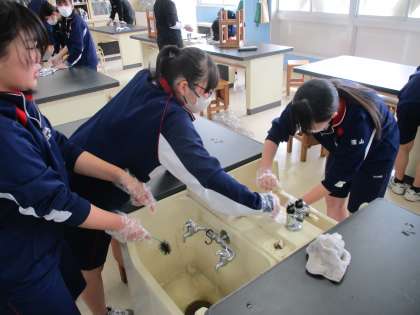2年生では、最後の理科の授業で1年間お世話になった理科室の大掃除を行いました。汚れが目立つシンクの中も、一生懸命に磨いてくれた生徒のみなさん、ありがとうございました。掃除をする姿勢の中にも、もうすぐ3年生になるという意識が伝わってきました。