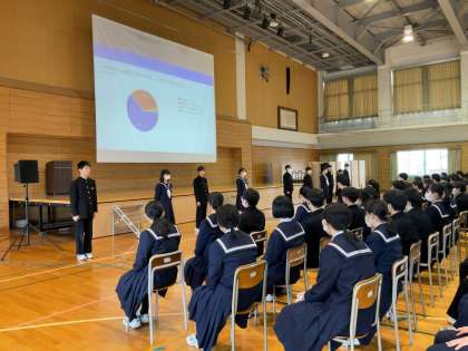 学年生徒会の発表では、以前とったアンケート結果を紹介しました。2学年で不安なこと、頑張りたいことともに、1番多かった回答が「学習」でした。まずは春休み中に1学年の復習をしたいですね。
