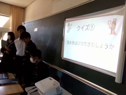 4月12日(金)3学年 京都班別学習のコース発表リハーサル 公開日 2024/04/12 更新日 2024/04/12 3学年 修学旅行の京都班別学習のコースぎめも大詰めです。20日(土)の授業参観では、決めたコースの発表会を行います。今日はその発表リハーサルを行いました。クイズ形式の班もあり(リハーサルでは答えは内緒です!)、来ていただく保護者のみなさまにも楽しんでいただけると思います。ぜひ、授業参観を楽しみにしていてください!