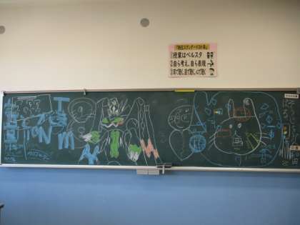 今日は1年生がクラス写真を撮りました。ひまわり級の生徒は、3組のみんなと桜の下で写真を撮りました。ひまわり級でも5人並んでクラス写真を撮りました。写真と一緒に写す絵を黒板に描きました。自分が好きな絵をいろいろ真剣に描いていました。