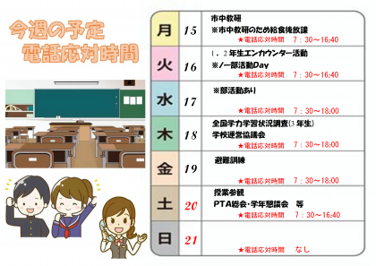 4月15日(月)〜4月21日(日)の予定 公開日 2024/04/15 更新日 2024/04/15 そ の 他 4月15日(月)〜4月21日(日)の予定です。 今週の水曜日より、保護者の方から許可をいただいた部や部員に限り、活動時間が延長されます。 17時30分下校完了となります。 それに伴い電話応対時間は18時までとなります。