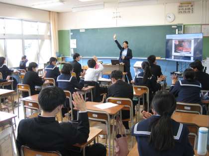 今年度からALTとして、新庄中学校で英語を教えてくださるフェイ先生の初めての授業が行われました。たくさんの写真を見せながら、出身国やフェイ先生の趣味、特技について紹介してくださいました。レッツ エンジョイ イングリッシュ!!