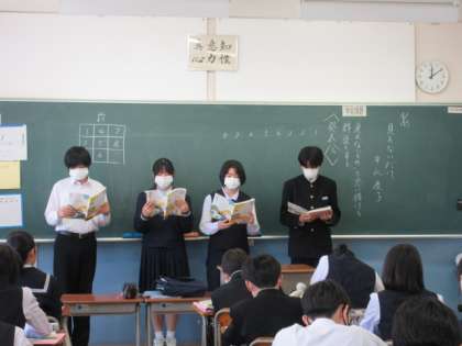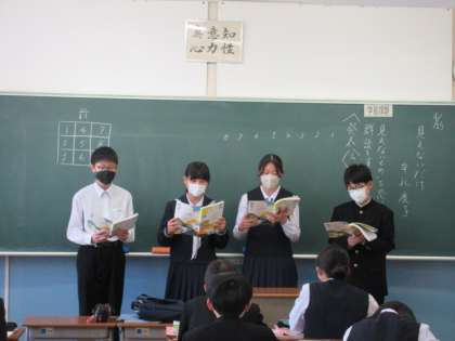 4月25日(木)2年生国語の授業 公開日 2024/04/26 更新日 2024/04/26 2学年 「見えないだけ」の群読発表会をしました。 どの班も、たった1時間で仕上げたとは思えない工夫と表現力で、素敵な発表会となりました。