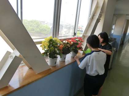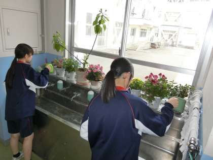 吹奏楽部では、GW中の活動の中で、教室棟の花鉢への水やりを行っています。
