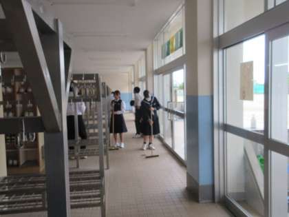 5月1日(水)生徒玄関清掃の様子 公開日 2024/05/01 更新日 2024/05/01 3学年 広い生徒玄関の清掃担当は3年1・2組です。 タイル部分は箒で掃き、廊下部分は雑巾で拭き取ります。真っ黒に汚れた雑巾が輝いて見えました。