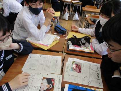 3−2家庭科 自分の幼い頃について発表し振り返っています。