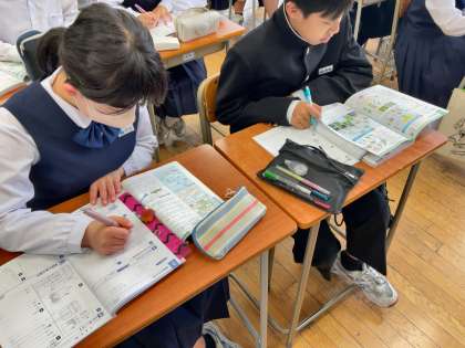 どの生徒も真剣に取り組んでいます。解説を見ながら問題に取り組んでいる生徒もいます。1年生で学習したことを、繰り返し復習することでしっかり定着させよう!