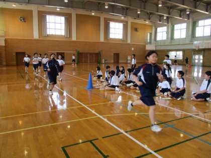 シャトルランが終わりましたが、次は男子は1500m走、女子は800m走の測定があります。今日は次時の測定に向けた練習を行っています。みんな息を切らしながら、一生懸命に体育館の中を走っていました。