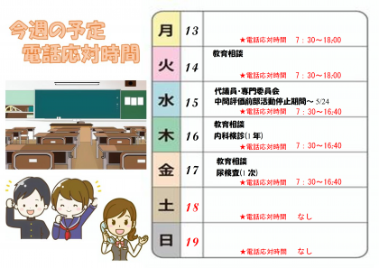 5月13日(月)〜5月19日(日)の予定 公開日 2024/05/13 更新日 2024/05/13 そ の 他 5月13日(月)〜5月19日(日)の予定です。 今週から5月23日(木)、24日(金)に実施される中間評価のテスト期間に入るため5月15日(水)より部活動が停止となります。 また、学期に一度の教育相談も実施されます。