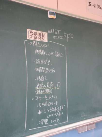 5月23日(木)中間評価1日目 公開日 2024/05/23 更新日 2024/05/23 3学年 3年2組の黒板を見ると、「学習課題」と担任からの応援メッセージが書かれていました。 これはがんばるしかありませんね!