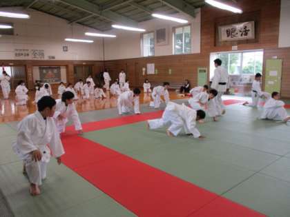 前回り受け身の練習をしています。上手な生徒は受け身を取った後、足が前の方に来ます。「先生もやってみて」と言われ、私も30年ぶりぐらいにやってみました。1度やってみただけで汗がじんわりとしてきました・・・