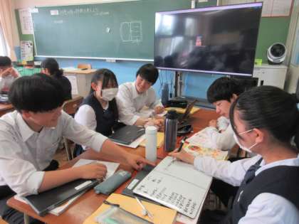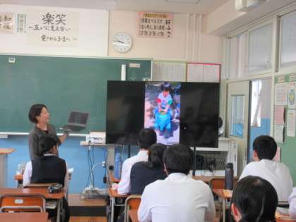 3年生の家庭科で、幼児の体の特徴について学習しました。ぎこちない手つきで赤ちゃんの人形をだっこした生徒たちは、「ぐにゃぐにゃしている…」「意外と重い!」などと驚いていました。その後、幼児の動画を見て気付いた「幼児の体の特徴」について班で意見を出し合い、ホワイトボードにまとめて代表者が発表しました。