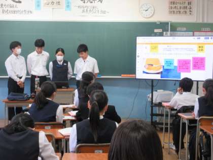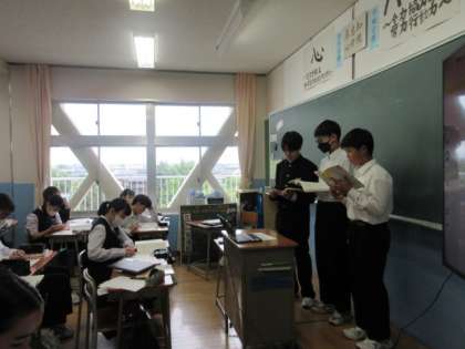 5月31日(金)2学年国語の授業 公開日 2024/06/02 更新日 2024/06/02 2学年 班で担当する短歌について、「プチ先生」として説明しています。みんなが想像しやすいように画像を選んだり、語句や表現技法について説明したりしていました。