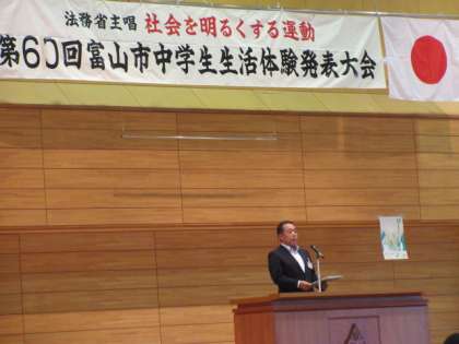 本日、本校で「第74回社会を明るくする運動」第60回富山市中学生生活体験発表大会を開催しました。富山市教育委員会、富山市校長会、保護司会、新聞社やテレビ局等の来賓をお迎えし、富山市内中学校10名の生徒が生活体験発表をしました。