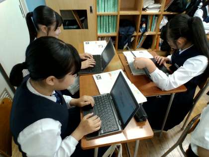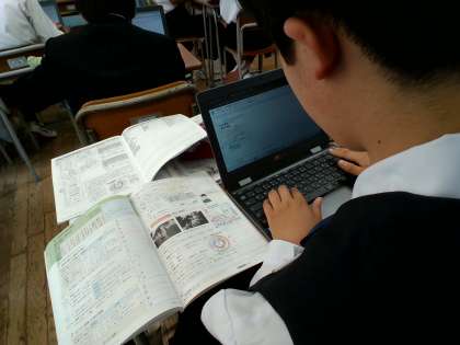 3年生の社会科では「太平洋戦争」についてまとめる活動を行っています。生徒はノート・Google1のドキュメント・スライド・スプレッドシート等、自分のまとめやすい手段を使って活動しています。