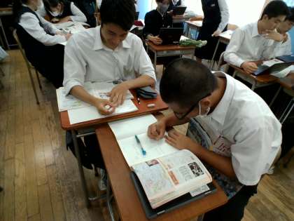 この活動では、「この出来事よくわからんから教えて〜」「画像挿入するときってどうするん?」と生徒同士がお互いに学び合い、教え合う姿が見られます。授業の終盤になると、会話が減り、より集中していく姿も印象的です。提出された物も個性が溢れており、点検することが楽しみです。