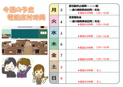 6月17日(月)〜6月23日(日)の予定 公開日 2024/06/17 更新日 2024/06/17 そ の 他 6月17日(月)〜6月23日(日)の予定です。 今週から期末評価前の部活動停止期間となります。