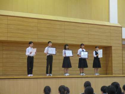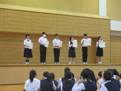 6月18日(火)受賞披露 公開日 2024/06/19 更新日 2024/06/19 学校行事 富山市中学校総合選手権や富山市中学生生活体験発表大会等で受賞結果を披露しました。様々な部活動がいろいろなところで活躍していることを知り、嬉しくなしました。次の大会に向けて頑張ってほしいです。