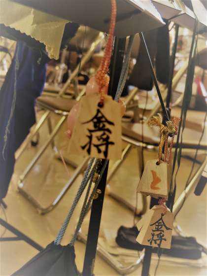 「金」の駒には「裏がない」という話、「歩」の駒は1つずつの前進しかできないが敵陣まで達すれば裏返って「金」となるという話に耳を傾け、その後の練習にのぞみ、中には自分の譜面台にその根付けをぶら下げている部員も見られました。