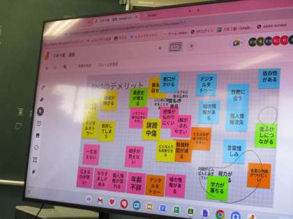 7月2日(火)道徳の様子 公開日 2024/07/03 更新日 2024/07/03 3学年 4組の道徳です。「ある日の午後から」というお話をもとに、SNSの使い方について班で話し合いました。SNSのメリットやデメリットは何か、ジャムボードを使いながら議論しました。