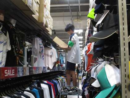 脚立を使って棚の上にある商品を取り、運んでいました。