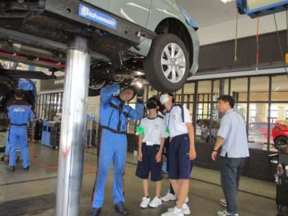 本日は、車の整備の様子を見学していました。整備士の方から車のつくりについて詳しく教えていただき、新しい発見が多くあったようです。その一方で整備士の方の作業の速さに驚いていました。