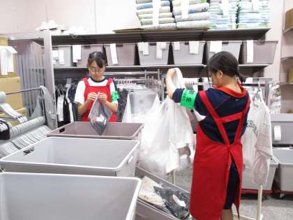 袋から取り出す人とハンガーにかける人に分かれて、二人で声を掛け合いながら効率良く行っていました。
