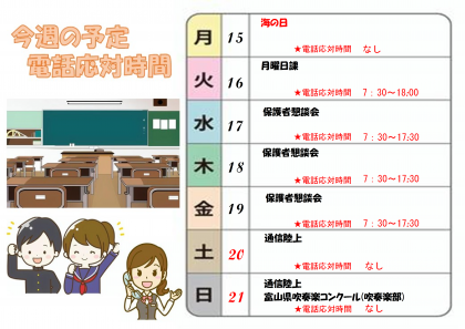 7月15日(月)〜7月21日(日)までの予定 公開日 2024/07/16 更新日 2024/07/16 そ の 他 7月15日(月)〜7月21日(日)までの予定です。 今週は、17日〜19日の3日間保護者懇談会が実施されます。 そのため、部活動は15時30分に下校完了となりますが、電話応対時間は17時30分までとなります。