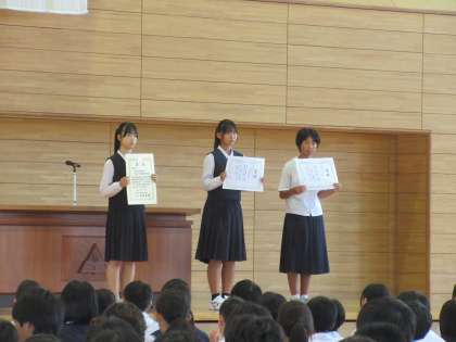 硬式テニス部と吹奏楽部の受賞披露を行いました。暑い中、よくがんばりました!