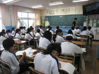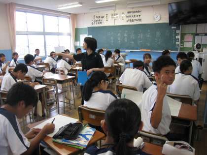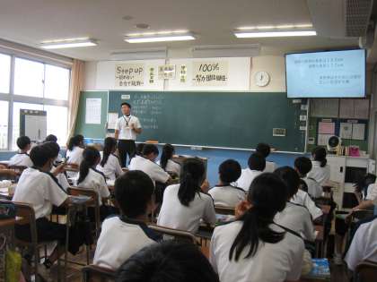 保健を行っています。「27歳の教員は、まだ背が伸びるのか?」という質問に盛り上がっていました。