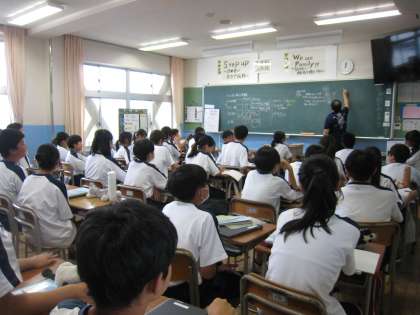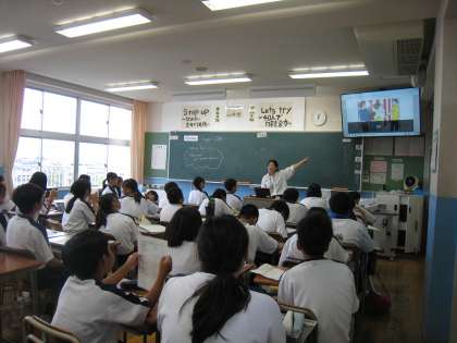 お気づきでしょうか、1学年の各教室に大型モニターが設置されました。さっそく、大型モニターに映し出された映像を見て、日本の夏祭りの質問について答えています。